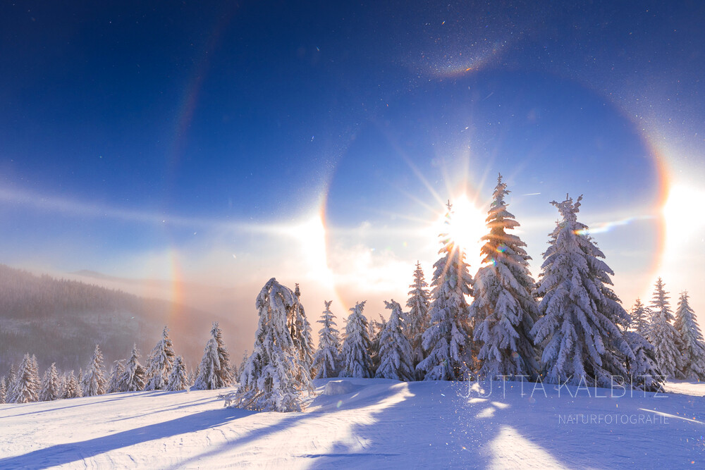 Alles begann im Prinzip schon zum Jahreswechsel im Riesengebirge: Als wir eines Morgens zu unserer Wanderung aufbrechen wollten, zauberten Kälte, Licht und feinste Eiskristalle eine überirdisch anmutende Erscheinung an den Himmel. Als Naturwissenschaftler spüre ich nicht den geringsten Hauch von Esoterik in mir – ansonsten hätte ich den Halo (man beachte die Form) als Omen für kommendes Unheil gesehen ;-) – so konnten wir das Ereignis einfach unbeschwert genießen und fotografieren.