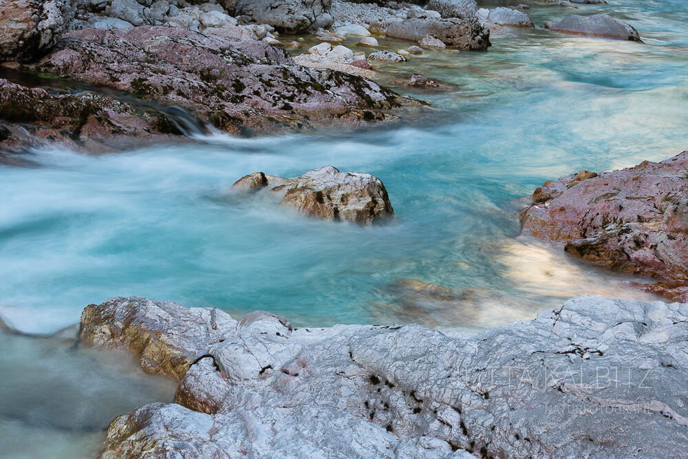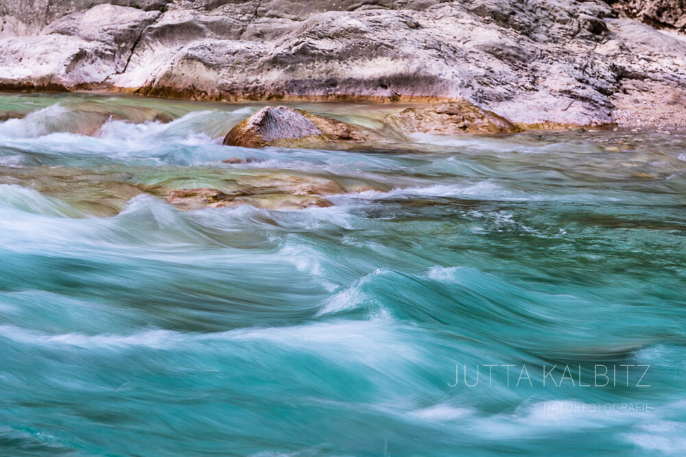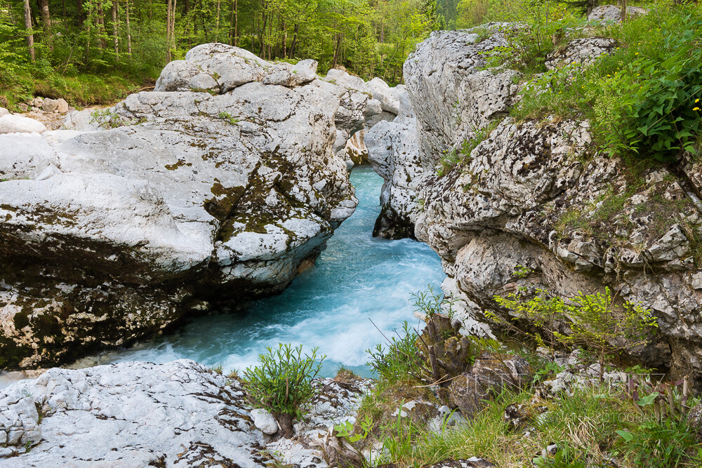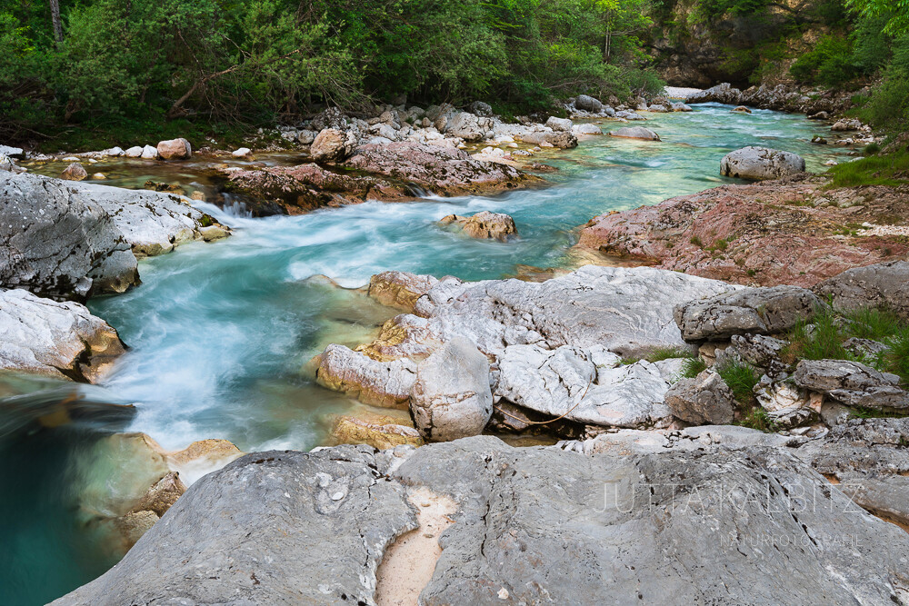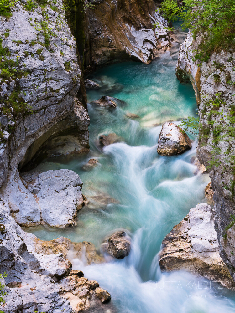 Gleich einem Aquamarin, Türkis oder Smaragd schlängelt sich die Soča mal gemächlich, mal durch enge Schluchten rauschend in ihrem Bett aus weißem und ockerfarbenen Kalkstein, der ihre Farbenpracht auf feinste Weise unterstreicht.