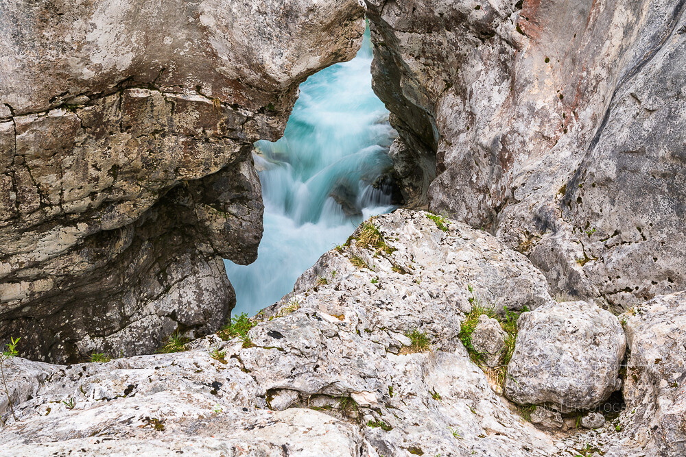 Am Fuße des Vrsič Massivs im slowenischen Triglav Nationalpark, tritt die Soča aus einer Karstquelle – je nach Regenfällen als sprudelnder Wasserfall oder aus Felsspalten sickernd ans Tageslicht.