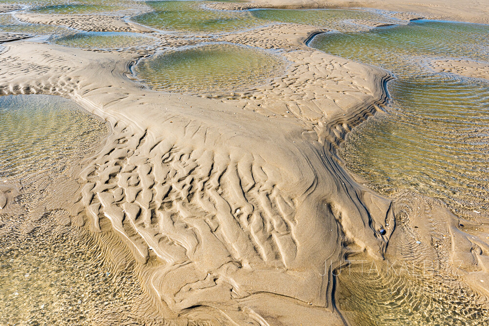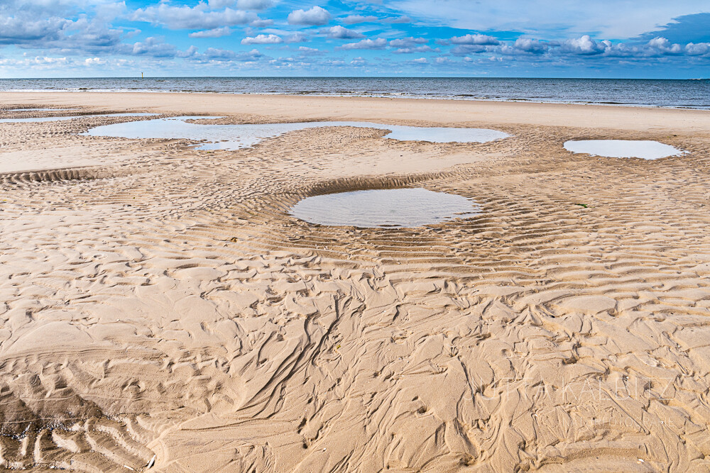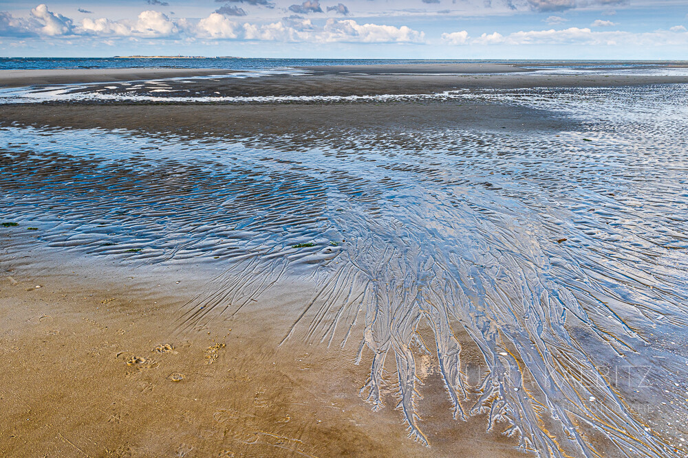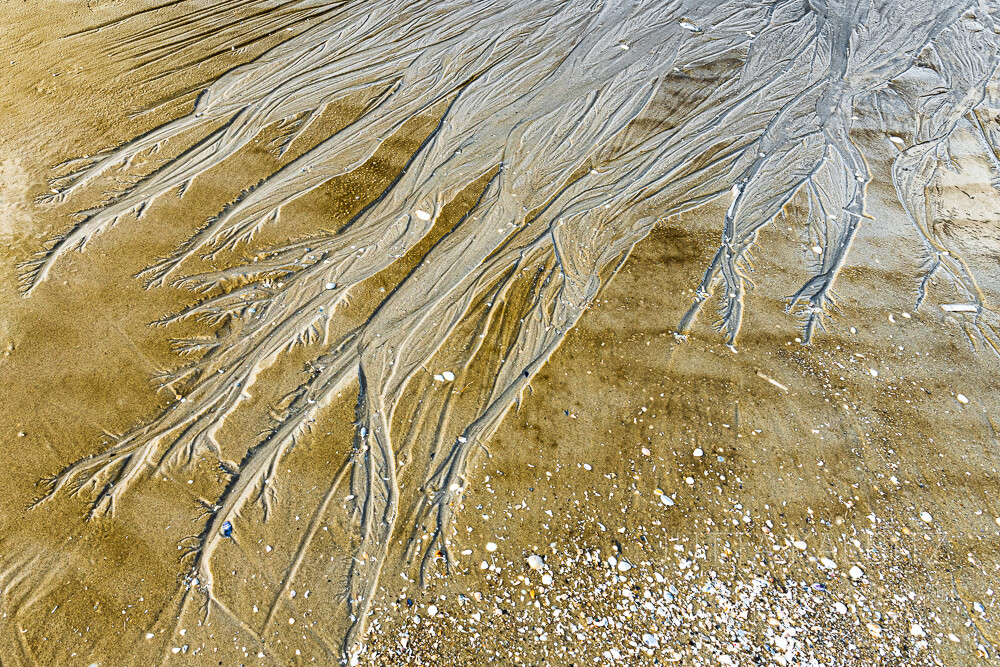 Und – es ist keineswegs trist, wenn sich das Meer in der Ferne nur erahnen lässt, sondern höchst spannend, jenes zu entdecken, was es auf seinem Rückzug hinterlassen hat! Muscheln, Algen, Krabben und natürlich die an fraktale Geometrien erinnernden Kunstwerke im Sand.