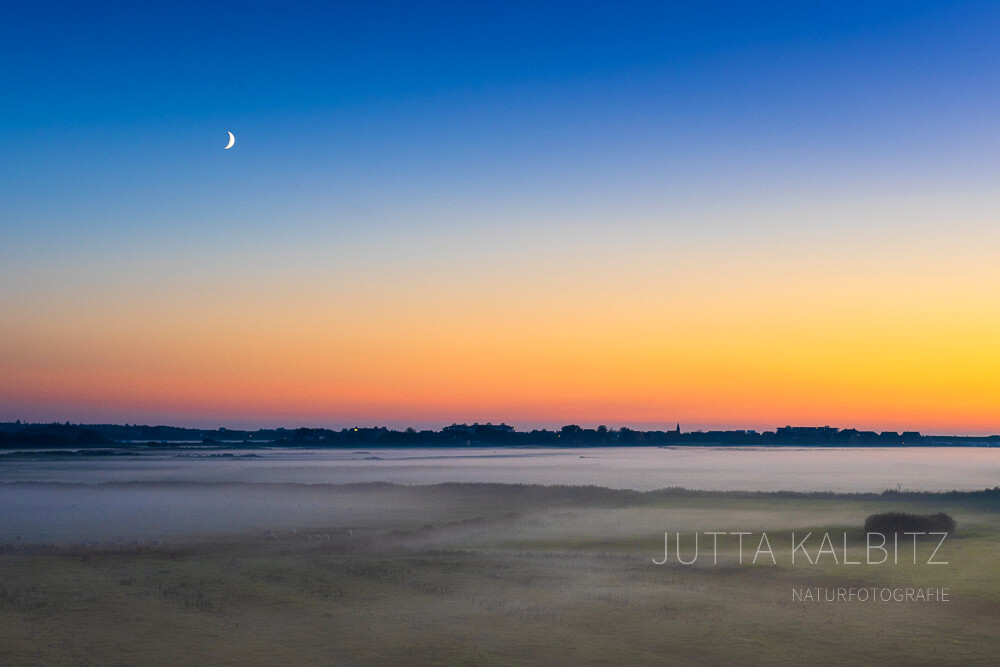 Es blieb zu warm, doch an den kühlen Abenden hielt der Nebel, vom Meer kommend Einzug. Er legte sich über die Salzwiesen, tastete sich über den Deich und breitete schließlich seine schützende Decke über dem Land aus. Eine plötzliche gespenstische Stille begleitete ihn, die nur von den Rufen der Austernfischer und dem aufgeregten Flattern einiger Wildgänse durchbrochen wurde. Es hätte nicht überrascht, wäre ein Schimmel mit dem Geist Hauke Haiens aus dem Nebel aufgetaucht. Allein schon die Erinnerung an diese Abende weckt Sehnsucht nach mehr.