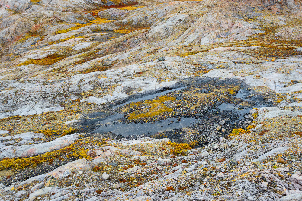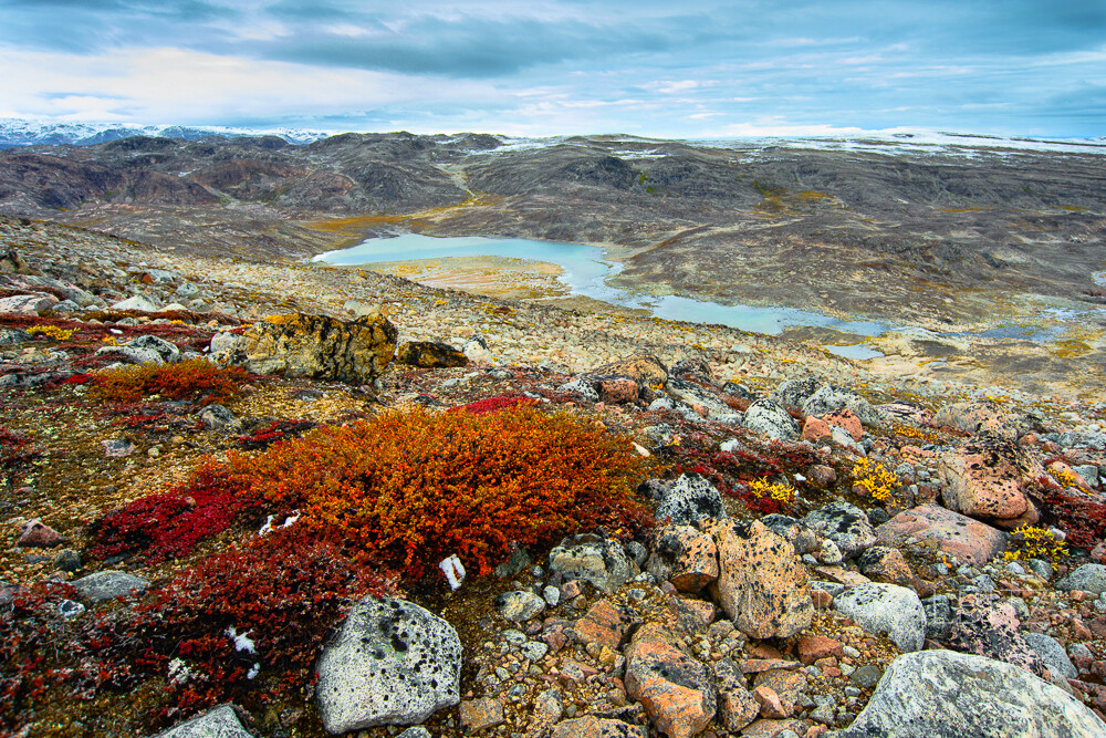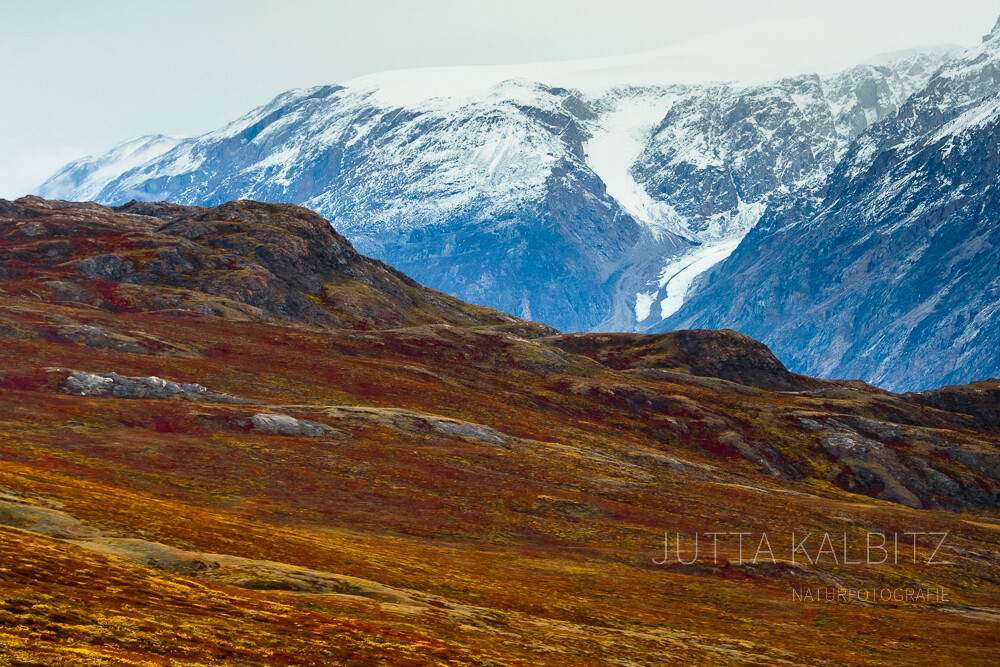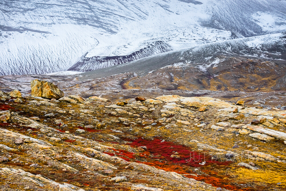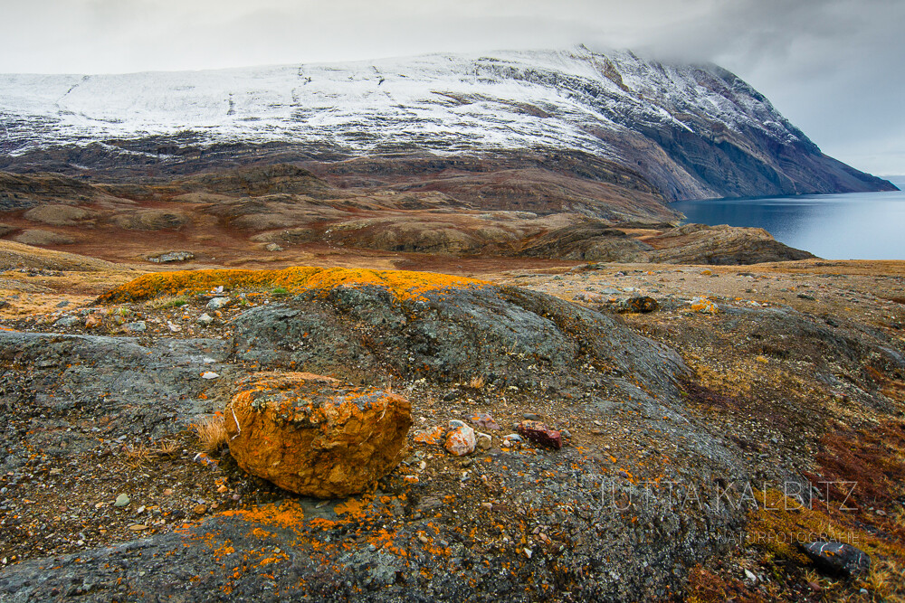 Überall leuchtet das Orange der Flechten und die mit einer dünnen Neuschneedecke überzogenen Berge bilden einen wunderbaren Kontrast zu dem überwältigenden Farbenspiel am Boden.