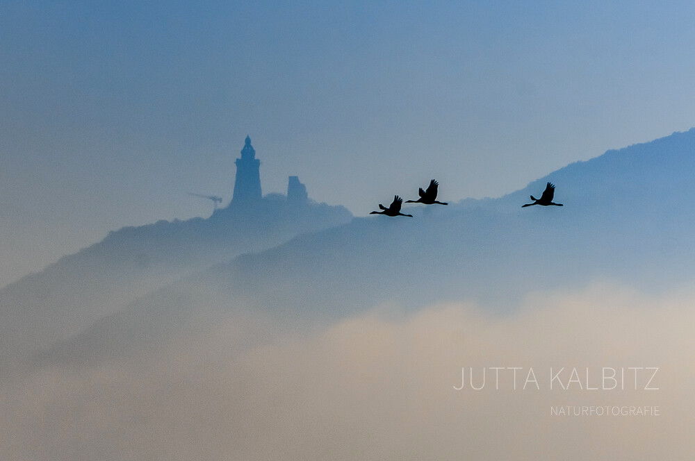 Ihre majestätischen Erscheinung und ihr Ruf als Vögel des Glücks machen Kraniche zu äußerst begehrten Fotoobjekten. Meist sieht man Bilder von ihnen auf Feldern und Wiesen, großformatige Portraits oder Kranichzüge im Licht der untergehenden Sonne. Das vergleichsweise ungewöhnliche Ambiente des Rastplatzes in der Goldenen Aue am Kyffhäusergebirge wollte ich unbedingt im Bild festhalten. Dazu suchte ich mir einen geeigneten Standpunkt gegenüber des Gebirgszuges und wartete, bis sich einige der morgens zu ihren Fressplätzen aufbrechenden Vögel auf Höhe der weithin sichtbaren Burgruine und des Kyffhäuserdenkmals befanden. Dass an diesem Tag bis weit in den Vormittag hinein dichter Nebel herrschte und die Kraniche erst bei höher stehender Sonne starteten, kam dem Foto insofern entgegen, dass sich die Akteure im diffusen Gegenlicht als schwarze Silhouetten gegen das Gebirge abzeichneten.