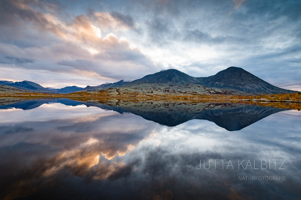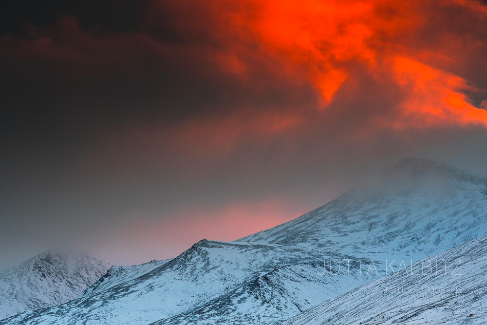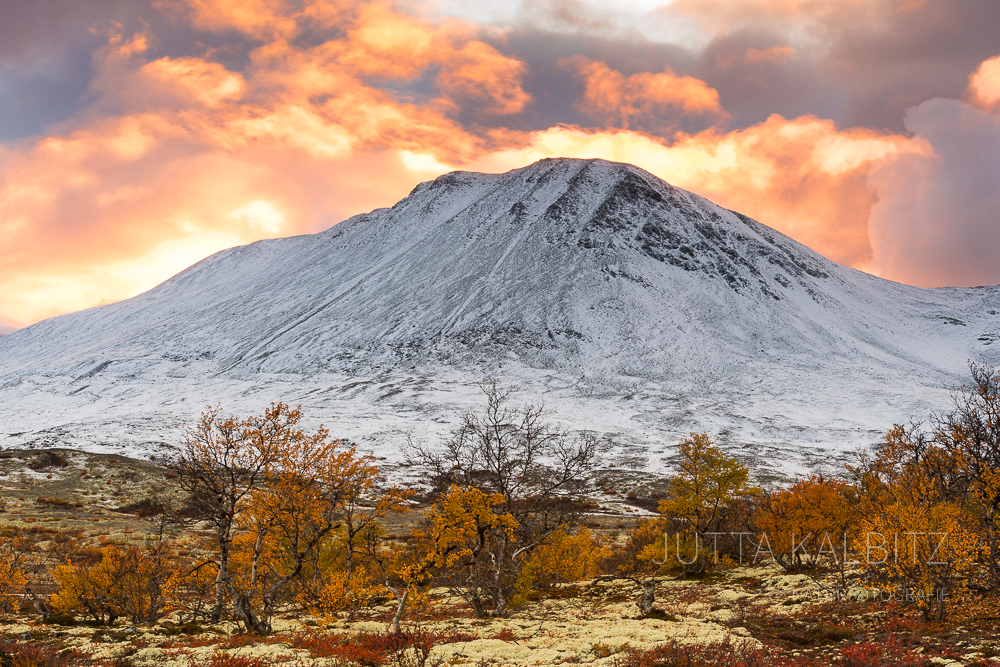 Das Abendlicht zaubert einen roten Schimmer über die herbstlichen Berge, es scheint, als wollten sie die letzte Wärme des Sommers einfangen. Wer jetzt unterwegs ist, spürt, dass dieser Hauch von warmen Licht trügerisch ist, denn ein kalter Wind eilt über das Fjäll.Überall dort, wo die Berge ihre Gipfel gen Himmel recken, werden sie von den Wolken berührt, die im dahin eilen ihre erste weiße Fracht über sie ausstreuen.