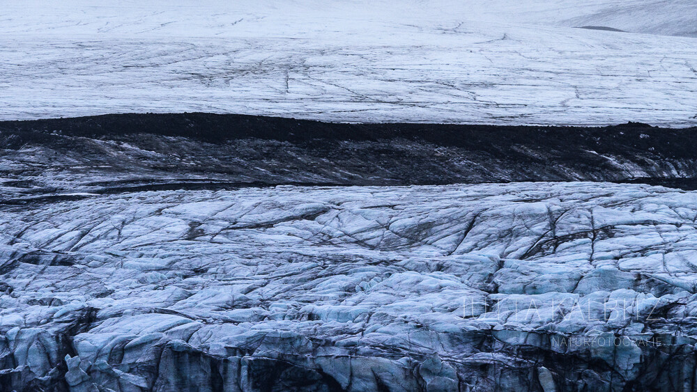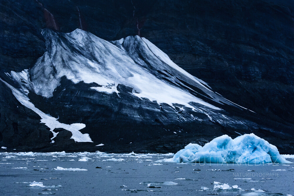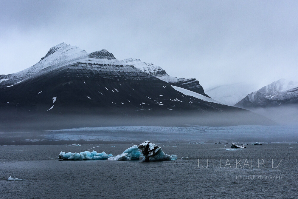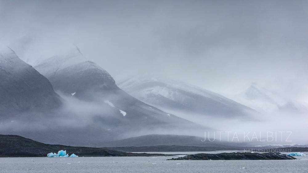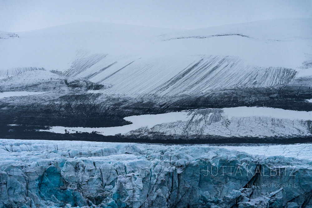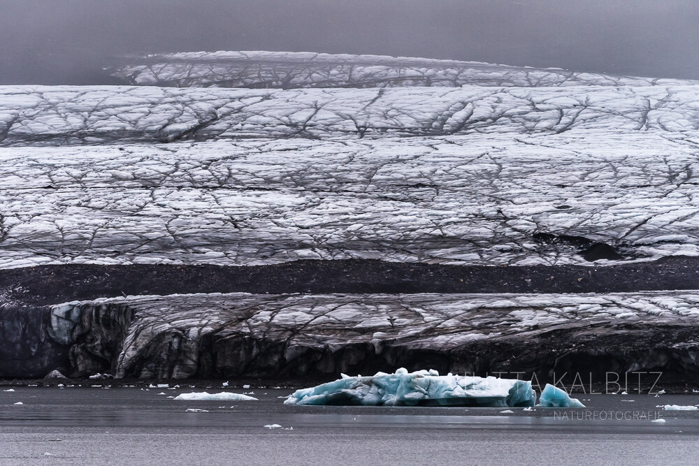 Wären da nicht die Bruchstücke des blauen Gletschereises, könnte man meinen, die Welt sei gänzlich in schwarz-weiß getaucht.