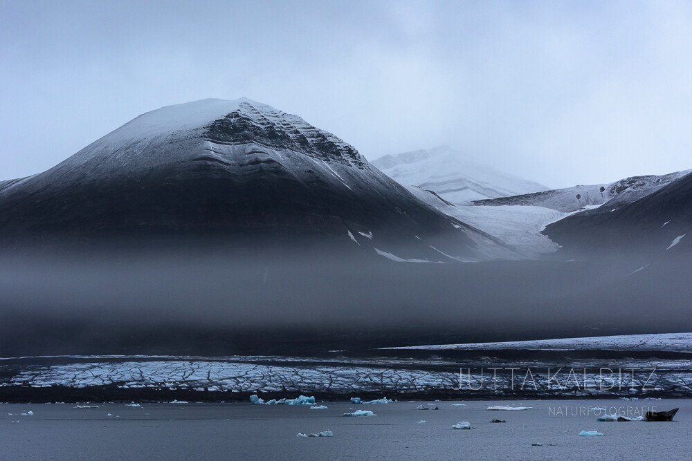 Manchmal scheint es, als fände die Gestalt der umliegenden grauen Gipfel ihre Wiederspiegelung in den kleinen, im Fjord schwimmenden Eisbergen.