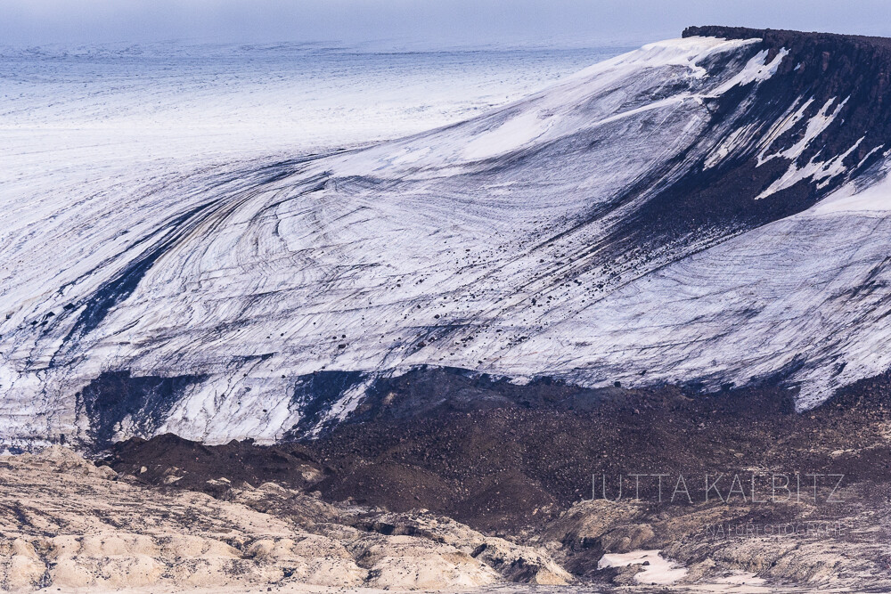 Manchmal sieht man am Fuße der Gletscher kleine Moränen, ebene wie kuppige und Sanderflächen, durch die kleine Flüsse mäandern.