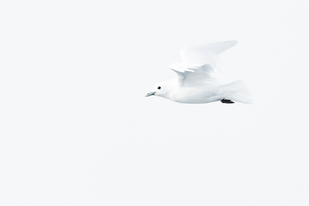 Im Packeis jenseits 80 Grad Nord treffen wir auf Elfenbeinmöven, die zu den schönsten und seltensten Mövenarten zählen. Edel gleiten sie mit ihrem reinweißen Gefieder durch die Lüfte und sind manchmal kaum vor dem eisigen Untergrund auszumachen.