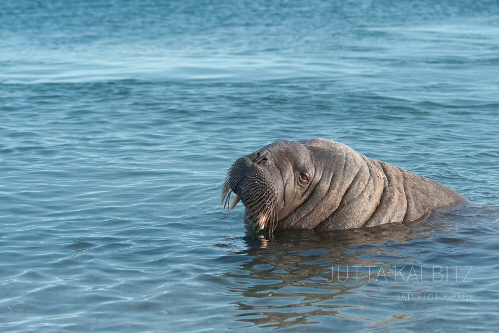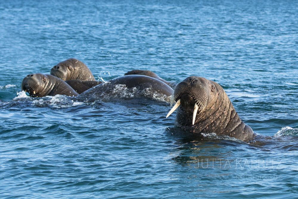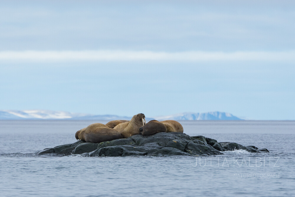 In gebührendem Abstand, denn man weiß ja nie, wozu ein hungriger Polarbär fähig ist, verbringen die Walrosse nahezu bewegungslos ihren Tag. Kein Wunder, denn ein solch schwerer Körper will erst einmal bewegt sein.