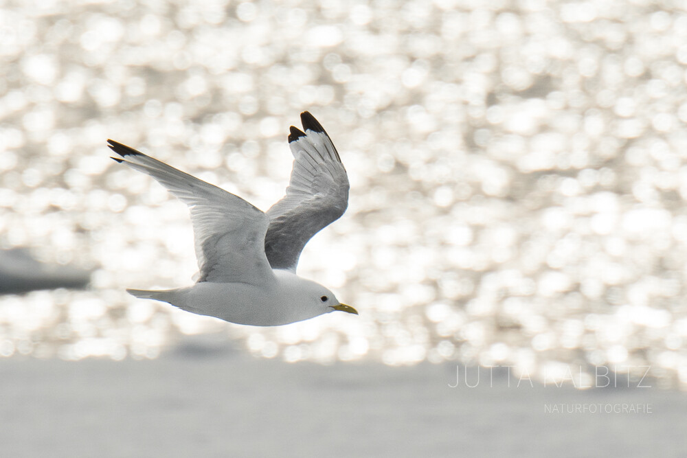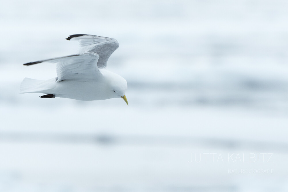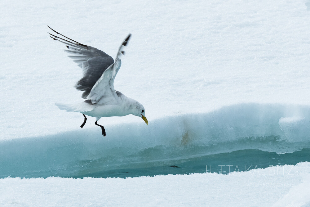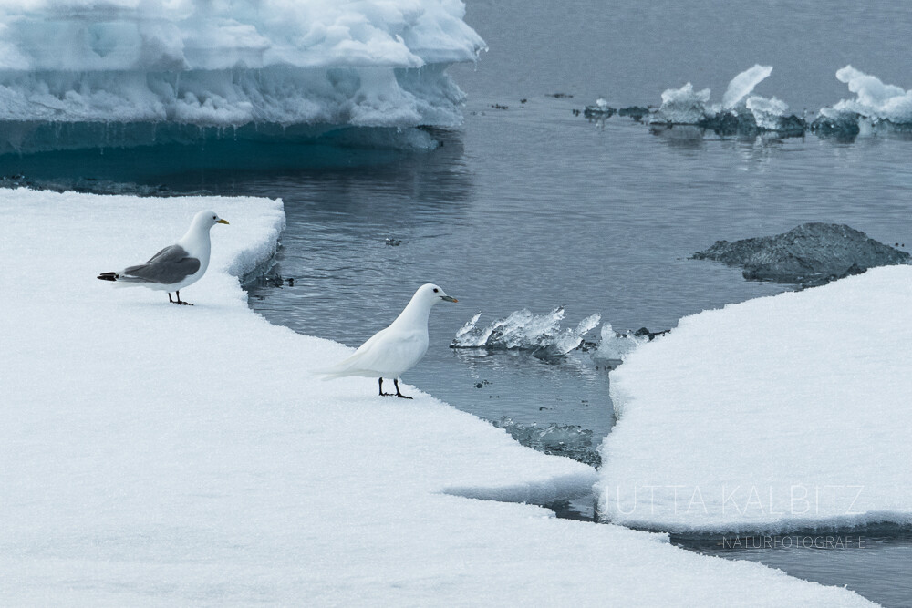 Immer wieder versuchen sie, wie auch die allgegenwärtigen Dreizehenmöven, in den schmalen eisfreien Spalten Fische zu ergattern.