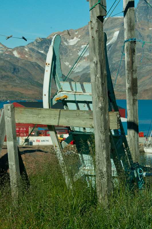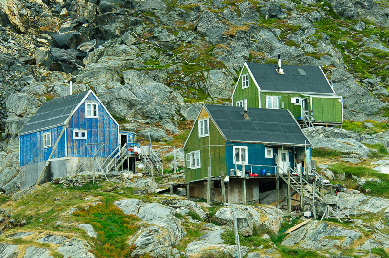 Sermiligaq an der Ostküste: Zum Schutz gegen den Schnee werden die Holzhäuser auf “Stelzen” gebaut. Jeder Meter muss dem felsigen Untergrund und dem Permafrostboden abgerungen werden. Das Baumaterial, Heizöl sowie alle Waren des täglichen Bedarfs müssen mit dem Schiff aus Dänemark geliefert werden, das dreimal im Jahr die Ostküste ansteuert.
