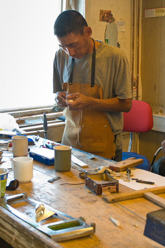 In der Werkstatt eines Tupilak Schnitzers: Tupilaks sind böse Geister mit menschlichen Gesichtern und Tierkörpern – ursprünglich wurden sie gefertigt, um Feinde zu bezwingen, denn sie töten jeden, der sich ihnen nähert. Nur Schamanen konnten sie erschaffen und zum Leben erwecken. Ein gefährliches Unterfangen, konnte es doch auch passieren, dass das Opfer zu stark war und sich der Tupilak dann gegen seinen Schöpfer wandte und ihn tötete. Es gibt einige Künstler, die es im Schnitzen dieser Figuren, die manchmal nicht größer als ein Daumen sind, zu einer hohen Perfektion gebracht haben. Wirklich leben können sie davon nicht.