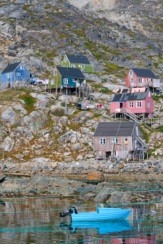 Sermiligaq an der Ostküste: Zum Schutz gegen den Schnee werden die Holzhäuser auf “Stelzen” gebaut. Jeder Meter muss dem felsigen Untergrund und dem Permafrostboden abgerungen werden. Das Baumaterial, Heizöl sowie alle Waren des täglichen Bedarfs müssen mit dem Schiff aus Dänemark geliefert werden, das dreimal im Jahr die Ostküste ansteuert.