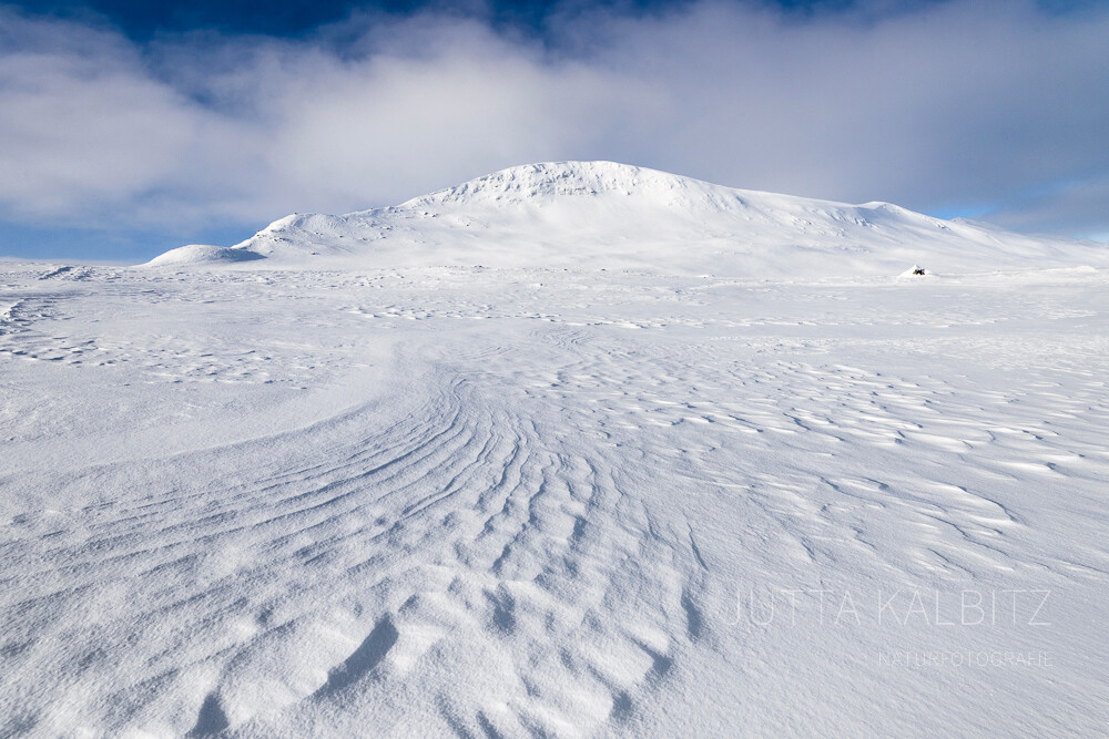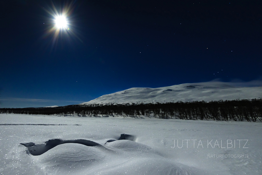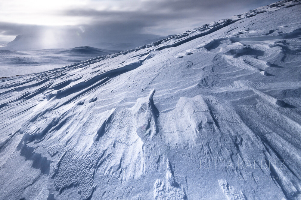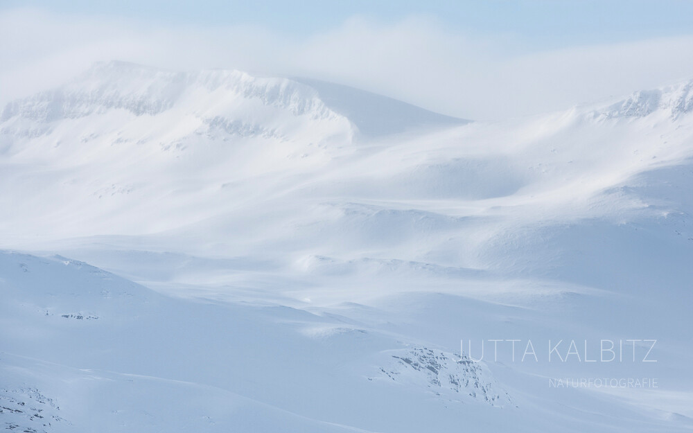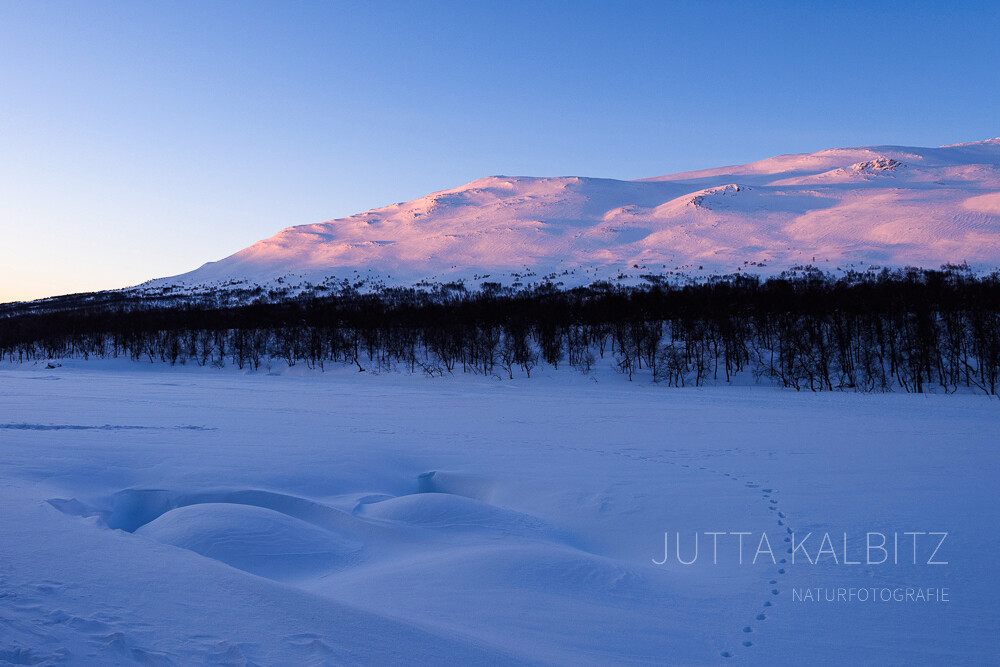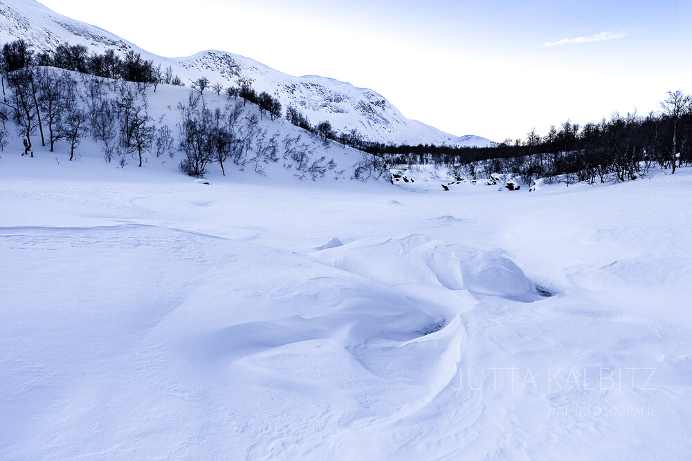 Die Landschaft ist geprägt von weiten Kahlfjälls und ausgedehnten Fjällbirkenwäldern. Jetzt im Winter reduziert sich die Natur auf das Nötigste. Oben in den Bergen dominieren riesige weiße Schneeflächen, die alles andere als eintönig sind, weil stetiger Wind und Kälte bizarre Strukturen in den Schnee gefräst haben.