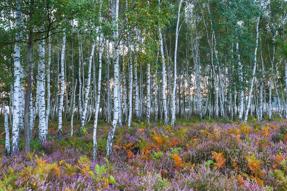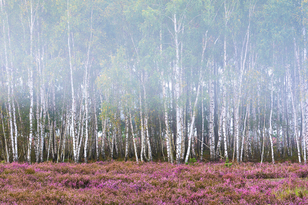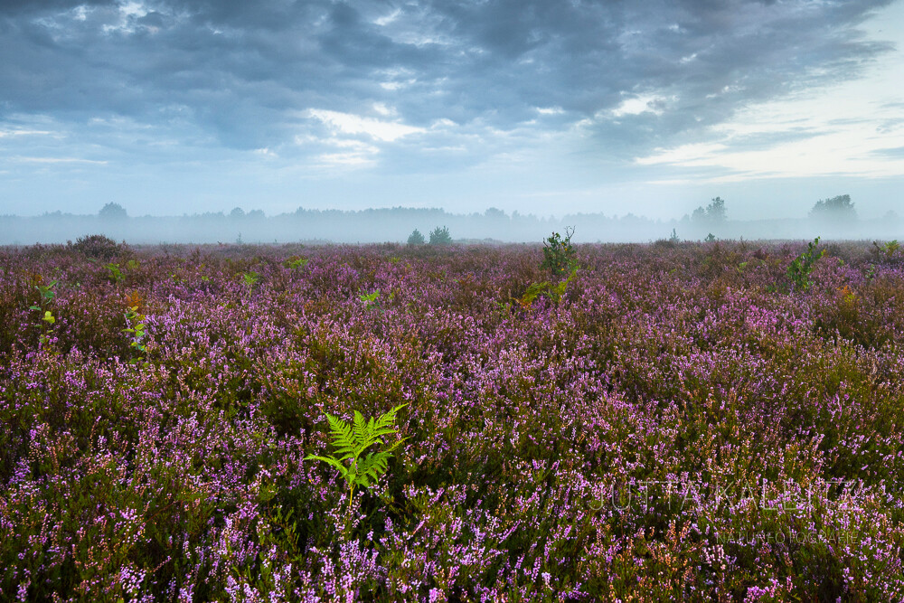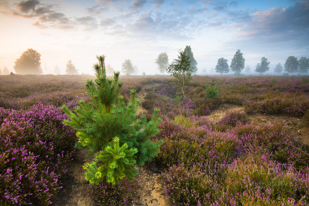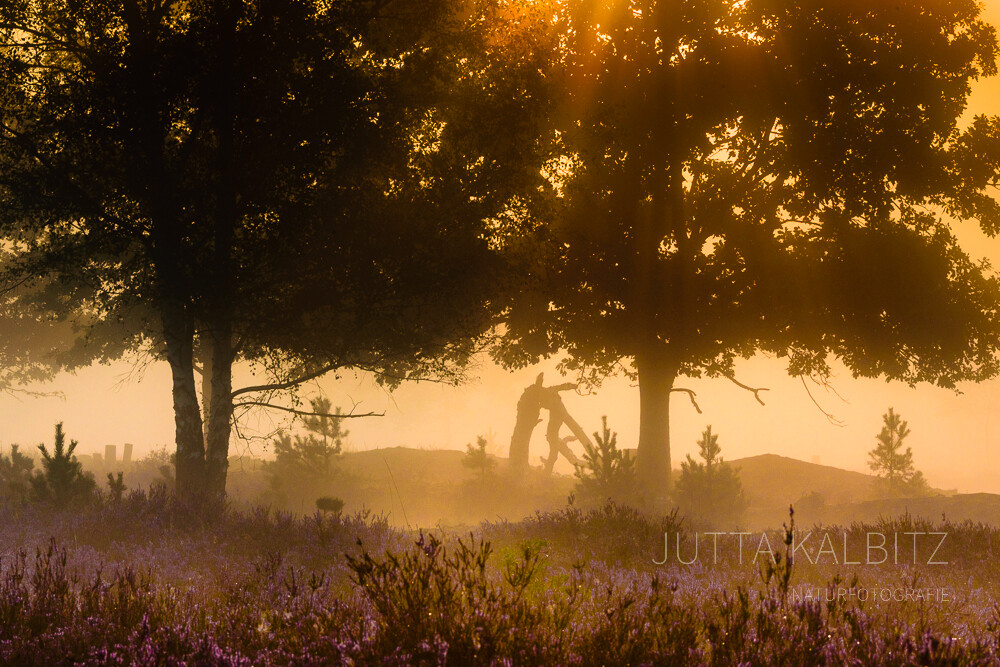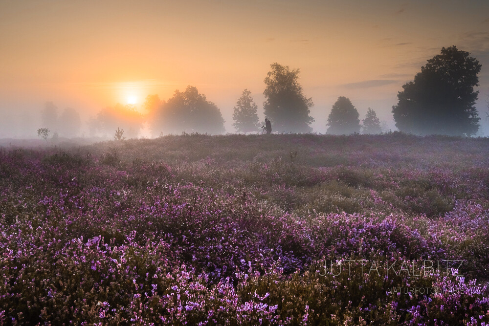 Handelt es sich dabei auch noch um gute Fotofreunde, bleiben kaum Wünsche offen – okay, halb 5 aufstehen, nachdem man bis Mitternacht zusammengesessen hat, eine halbe Stunde in der Dunkelheit mit Fotogepäck auf einem Mietfahrrad über Sandwege und durch bis zu 20 cm tiefe Pfützen zu fahren ist sicher nicht für jeden die Offenbarung. Aber mal abgesehen von dem Spaß, den wir dabei hatten, wurden wir spätestens dann entschädigt, als wir den Wald hinter uns ließen, sich vor unseren Augen eine weite blühende Heidefläche öffnete, diese dazu auch noch, wie erhofft im Nebel lag und ein schöner Sonnenaufgang zu erwarten war… Fotografenherz, was willst Du mehr?!