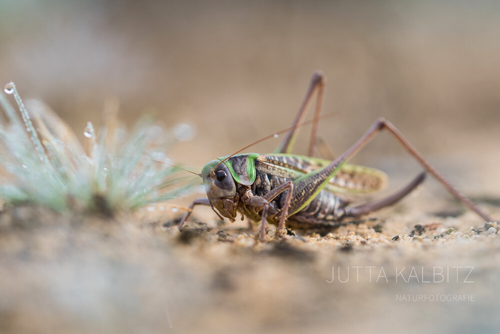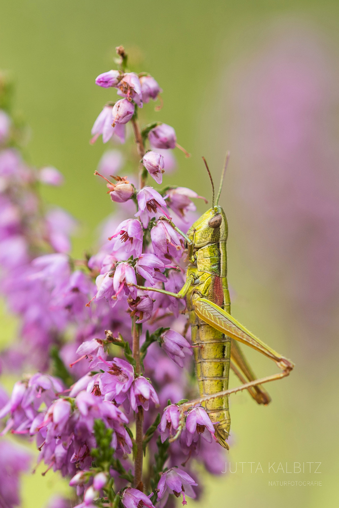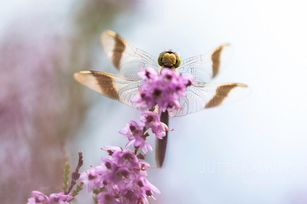 Mit der Überschrift „Vom Panzerrollen zur Purpurpracht“ wirbt der Naturpark Niederlausitzer Heidelandschaft für ein wahres Schauspiel, das ab Mitte August bis Anfang September diesen nicht gerade für spektakuläre Eindrücke bekannten und daher häufig unterschätzten Landstrich in ein wahres Blütenmeer verwandelt. Weite Teile der 300 ha umfassenden ehemaligen Truppenübungsplätze sind mit Teppichen blühender Besenheide übersät, die je nach Lichteinfall mal rotviolett bis dunkellila erstrahlen. Und wie man sich unschwer vorstellen kann, üben diese eine magische Anziehung auf den Naturfotografen aus. Nicht nur der, der es liebt, die schöne Landschaft auf den Chip zu bannen, nein auch der Makrofotograf, der den kleinen verborgenen Dingen frönt, kommt hier voll auf seine Kosten und kann, wenn man wie ich mit fachkundigen Fotografen unterwegs ist, noch allerhand lernen – über Gebänderte Heidelibellen, Warzenbeißer, Gold – und Schönschrecken und vieles mehr.